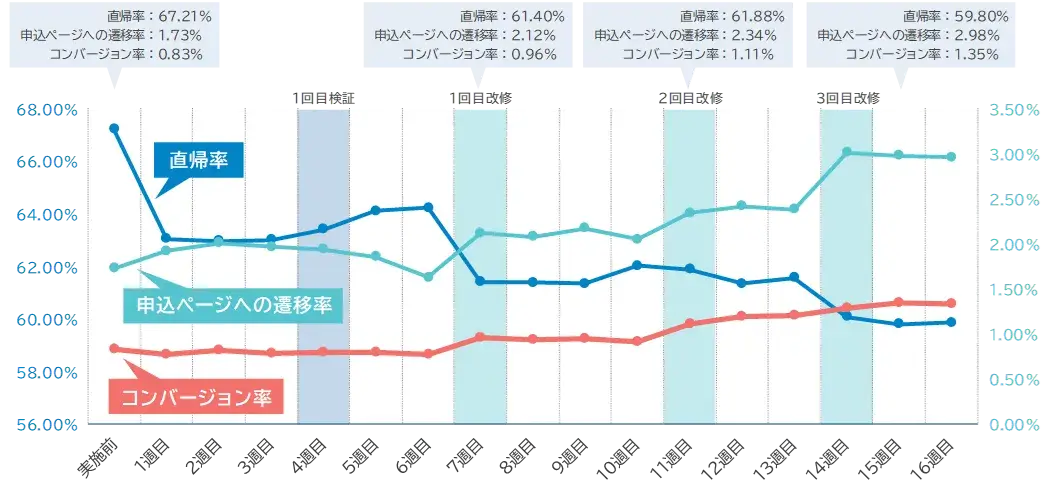 下図は転職エージェントA社様における実施結果の推移を週次で集計したものです。3回目の改修時点でコンバージョン率が1.63倍まで向上しました。実施後の状況に合わせて改修を繰り返し、効果を出し続けている典型的な例です。